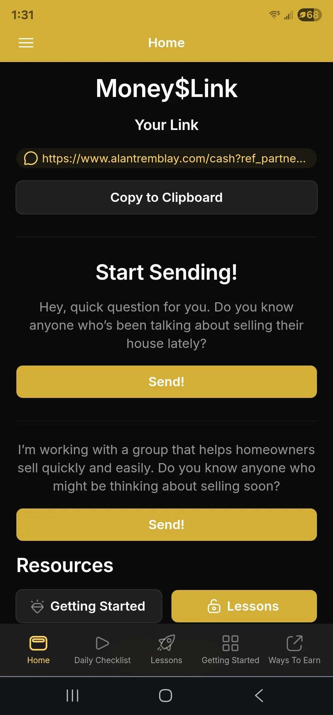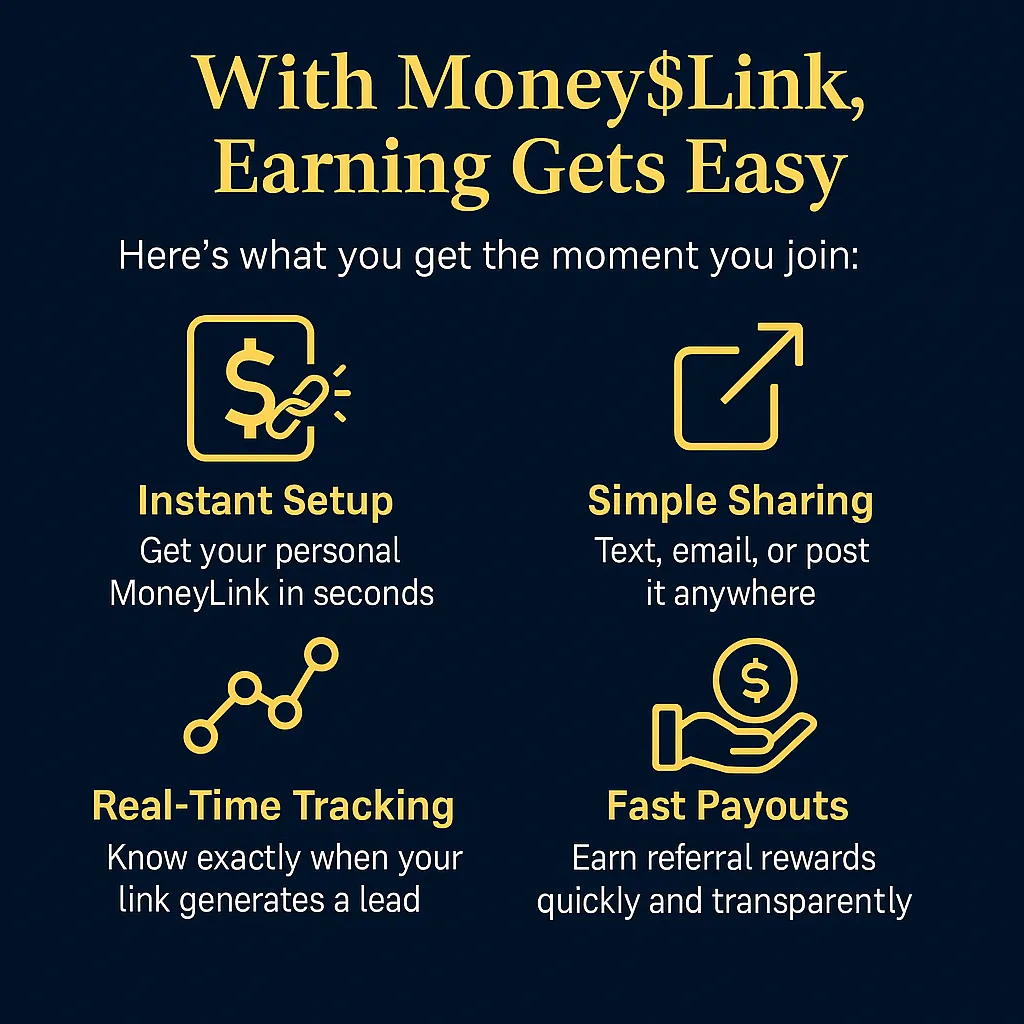 Money$Link is a referral program created by Alan Tremblay. You get a personal link, share it with your contacts, and if one of them sells their property through us, you get paid a referral reward.